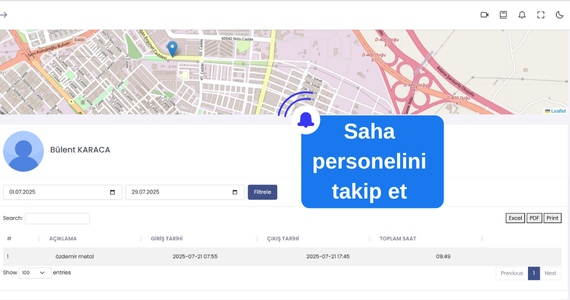 Personelin konum bilgilerini harita üzerinden canlı takip edin. Görevli personelin nerede olduğunu görün, çalışma alanlarını denetleyin ve operasyonel verimliliği artırın.